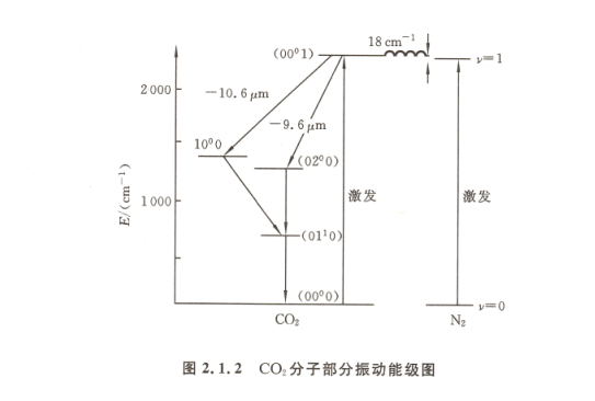 激光器通過電激勵把CO2分子激發到000 1上能級,稍后,co2分子從上能級跳到下能級10和020,放出10.6f'm和9.6 F/rrlCo2激光。其中,9.6 )um激光由于競爭效應被抑制,而10.6 t/m激光被諧振腔實現光放大,通過輸出鏡輸出激光co2分子可通過直接電子激勵產生粒子數反轉,但增益不大。加入N2后,由于N2分子的y-1能級與C09分子的0001能級的高度相近,所以,在低氣壓連續運轉或高氣壓脈沖運轉的器件中會發生能量的共振轉移。