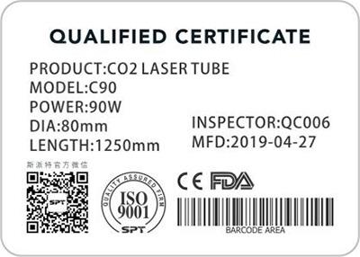 此標簽指示激光管的編號、型號、長度、管徑、功率、檢測人員、出廠日期,IS9001 質量管理認證、CE 認證、FDA認證。
