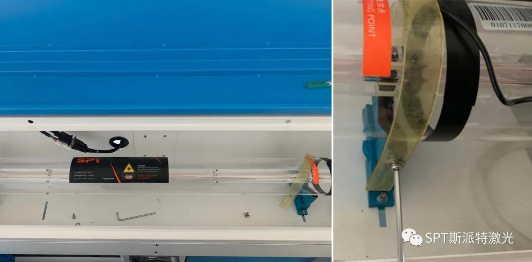 注意:為防止光路變化,保持與拆卸之前的位置一致,激光管的LOGO標簽朝上放置,激光管的兩個支撐點要在激光管總長1/4的點上。