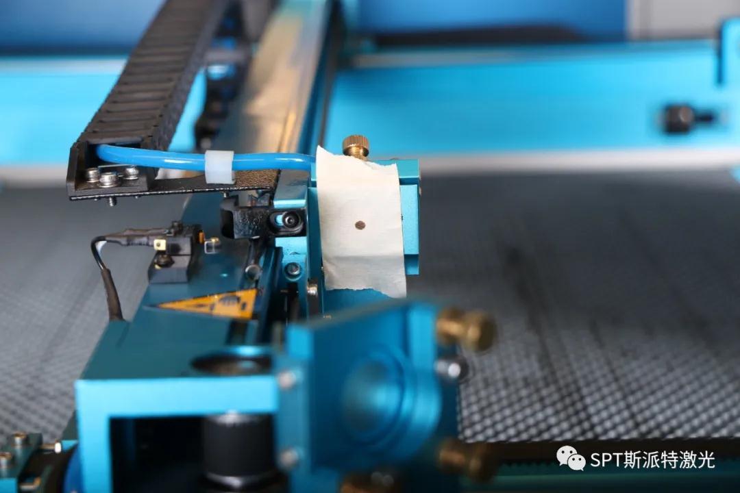 在 3#反射鏡下面聚焦鏡筒的入光口處貼上雙面膠紙,按點射,在紙上打上標記。如果如果標記在膠紙的中心處,則光路調整完成。第十一步:若激光未落在入光口的中心,如下圖,則要按照以下步驟進行調節,直到激光點射標記落在出光口處雙面膠紙的中心處。