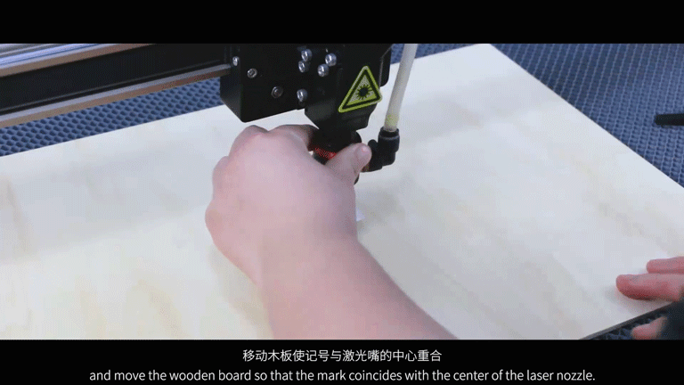 激光嘴下移至美紋紙表面,移動木板使記號與激光嘴的中心重合。